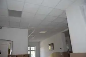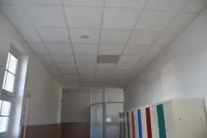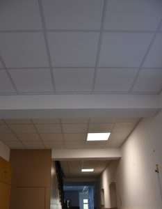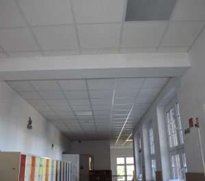 Megújult az első emeleti folyosó: elkészült az álmennyezet, mely eltakarja a vasbeton gerendákat és a vezetékeket. A korábban felszerelt energiatakarékos lámpák is szépen belesimultak az új mennyezetbe.